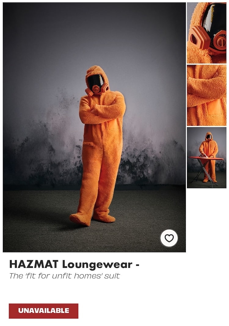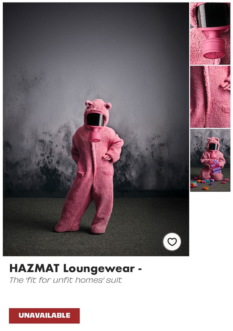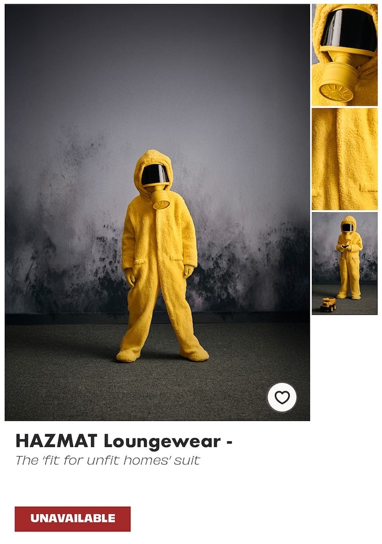 Why hazmat suits? Many people are living in housing with issues like damp, cold and mould and yet the public aren’t always aware of the serious health risks associated with these conditions. We wanted to visualise these health hazards by imagining what kind of clothing you might need to protect yourself from these health harms — to make people pause and reflect on what can be done to ensure people have access to warm, safe and stable housing.